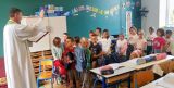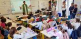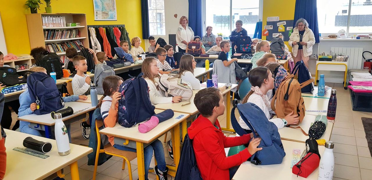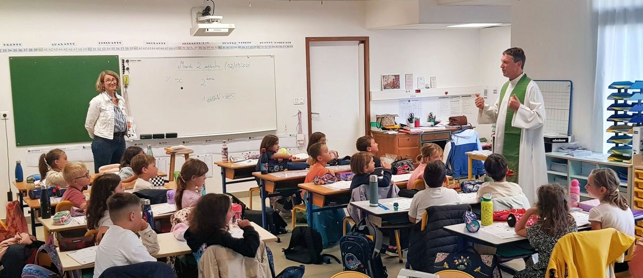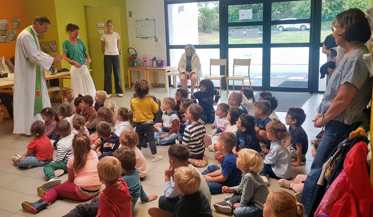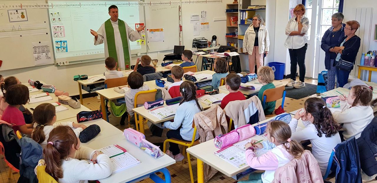En fin de matinée, le Père Xavier est venu à la rencontre des élèves et a béni leur classe et leur cartable, pour leur donner la force de bien travailler tout au long de cette année scolaire. Il était accompagné de 4 paroissiennes d’Arzal.